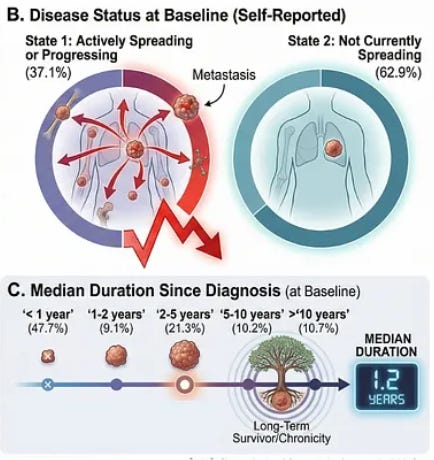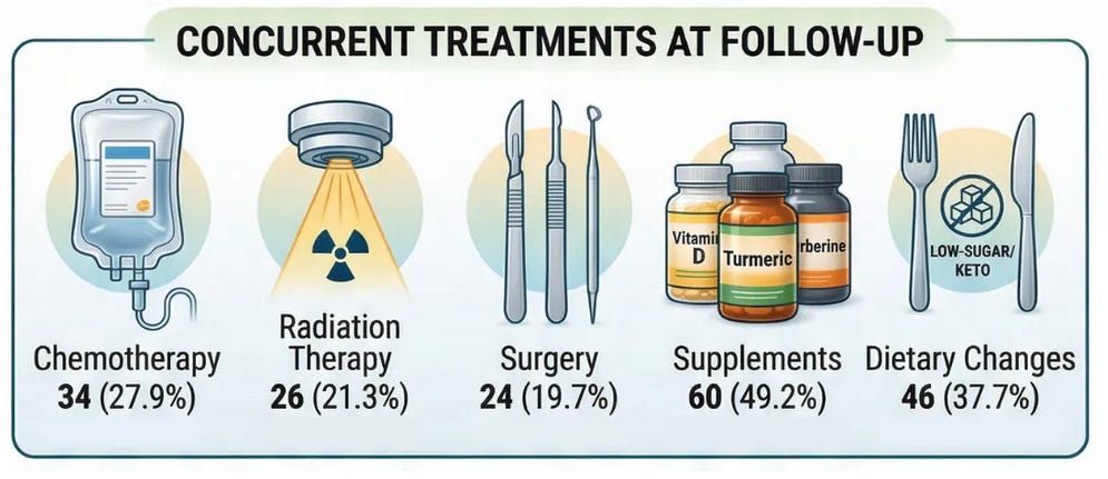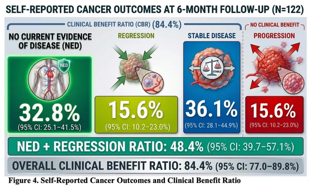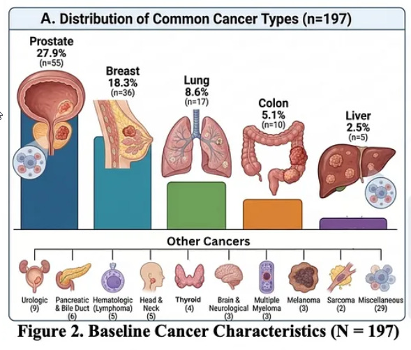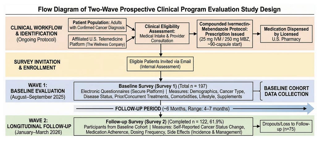 « We analyzed a prospective observational cohort of 197 cancer patients, with 122 completing structured follow-up at approximately six months (61.9% response rate). Patients were prescribed a compounded ivermectin–mebendazole protocol by licensed U.S. providers, and outcomes were collected through standardized digital surveys assessing cancer status, adherence, and safety.
