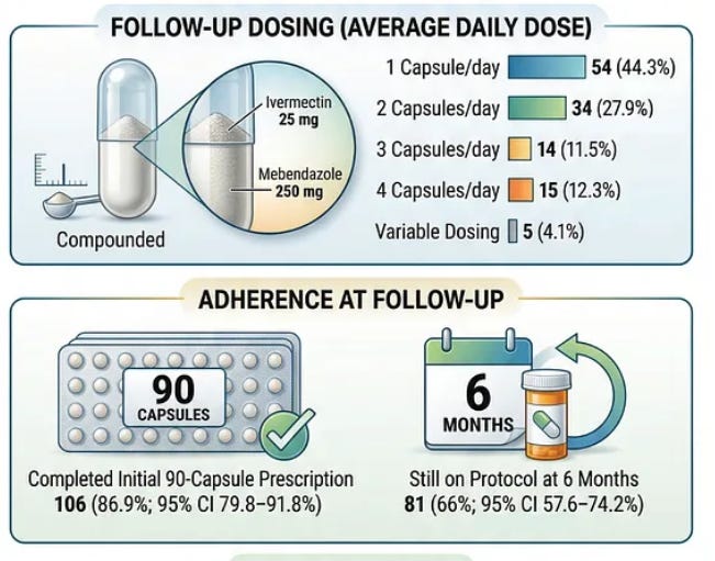 Each capsule contained 25 mg ivermectin and 250 mg mebendazole, with dosing individualized by clinicians—most commonly 1–2 capsules per day, though a subset of patients used higher daily dosing or cyclic regimens depending on disease status and tolerance.