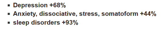 ** at 3 months: +44% had Anxiety, dissociative, stress, somatoform disorders.