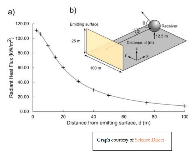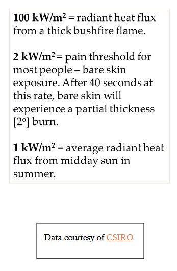 This graph below shows heat radiation levels from a « thick bushfire flame » related to distance from the bushfire source.
