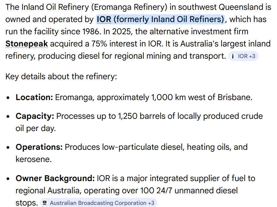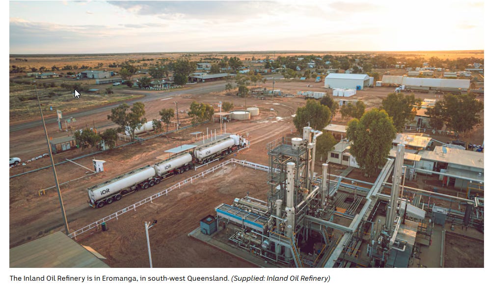 There is already a small Diesel refinery west of Roma ~ the Eromanga Inland Oil Refinery. This could be upscaled to produce more Diesel, necessary for Rural operations.