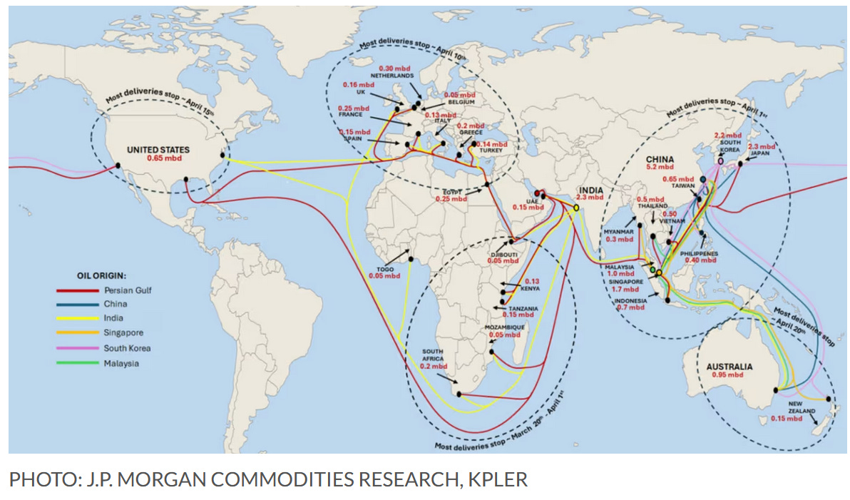 « It means that the oil people are consuming right now in a lot of countries is not postwar oil supply. It is pre-war supply that is only now arriving. And even if the straight of Hormuz opens tomorrow, it will take that oil four to 5 weeks to reach its destination. That is why the map ~ in this video ~ is so powerful because it tells you exactly why things still look weirdly normal.