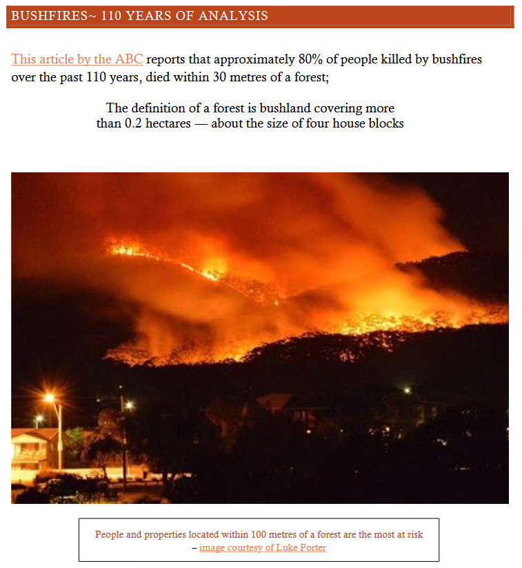 It provides homeowners living in rural or outlying suburbs with a comprehensive Operational Plan [OPSPLAN] for reducing bushfire devastation to homes, properties, businesses and communities.