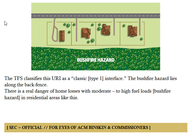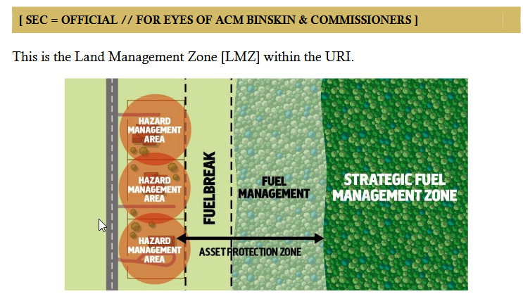 This elevated view clearly shows that homes/vital assets within the Hazard Management Area have a Fuel Break and then a Fuel Management area adjoining the Forest or Bushland Zone.
