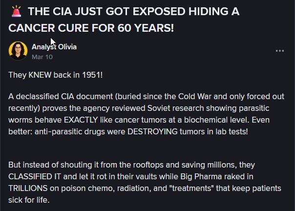 For about 50 years, there has been sparse animal evidence, some case reports of anti-parasitics and cancer.In fact, in the 1950s, the CIA actually uh classified a document in the 1950s that was showing anti-parasitics had anti-tumor effects.