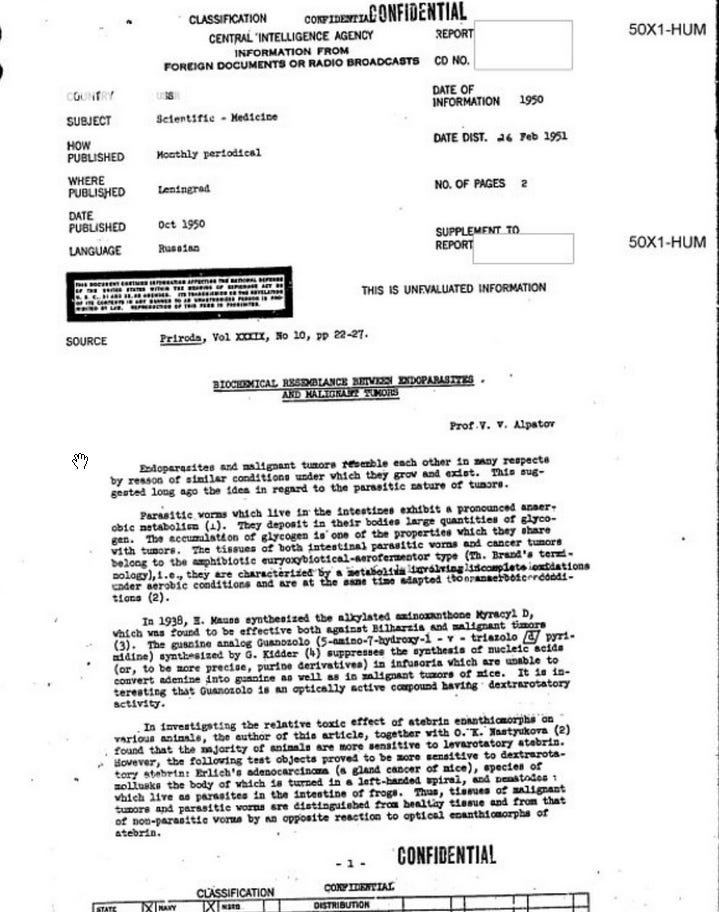 It was a Soviet study. These Soviet scientists found that both tumors and parasites um and these anti-parasitics exerted similar mechanisms and they found that it exerted anti-cancer activity in animals and that study was classified by the CIA in the 50s or 60s and not declassified until 2011.»