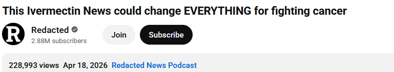 This Ivermectin, anti-parasitics, fenbendazole, mebendazole have been demonized by the bio-pharmaceutical complex, the vaccine cartel and the chemo cartel now because it threatens their massive profiteering model, of profiting from cancer patients and vaccines.Because if we go back to COVID 19, if Ivermectin, if they admitted that Ivermectin was at least partially effective, they would have never have been able to emergency authorize the mRNA gene transfer injections.»