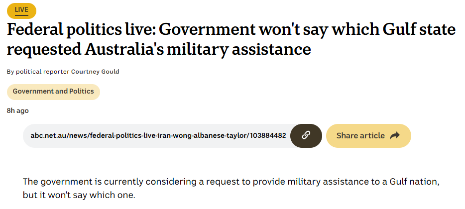 It appears that Australia may consider sending military support to one of the Gulf nations ~ the specific country has yet to be named.