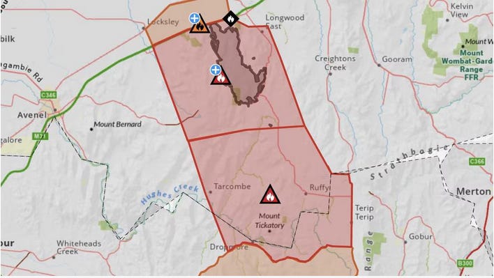 The alert has been issued for Locksley, Longwood, Longwood East, Ruffy, Tarcombe, Upton Hill, Dropmore, Ruffy, Avenel, Caveat, Highlands and Terip Terip – all roughly 150km north of Melbourne.