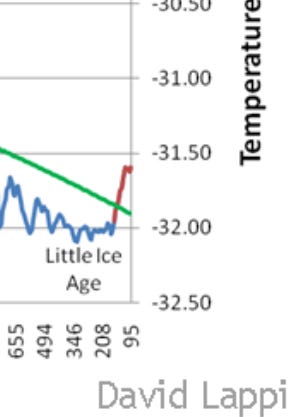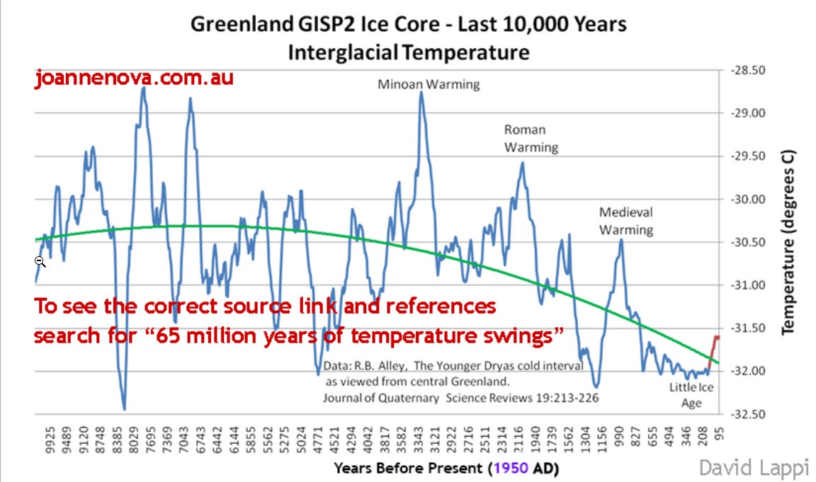 Here is the « Bigger Picture » covering the past 10,000 years of Ice Core temperature variations. A Longer Period that clearly shows a Global Cooling Trend.