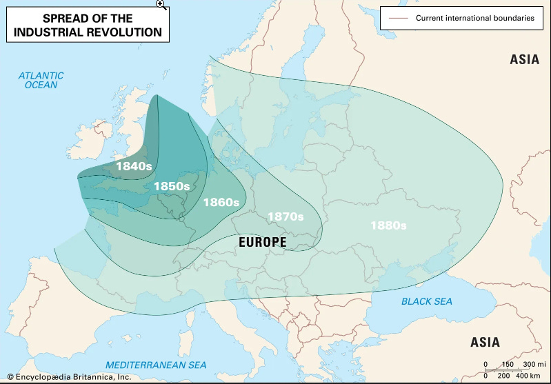 The Industrial Revolution was a gradual development, beginning in the 1840s in the UK, spreading Eastwards.