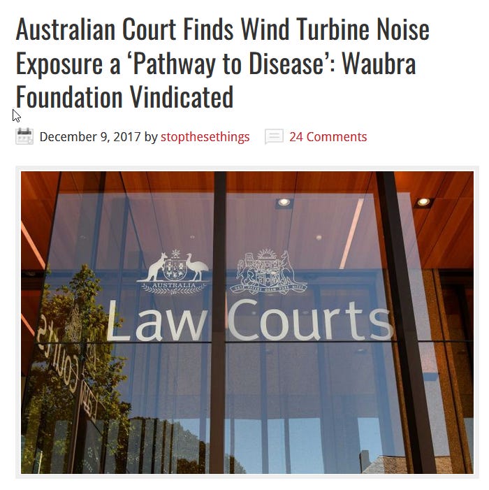 In a World first, Australia’s Administrative Appeals Tribunal (AAT) has declared that the « noise annoyance » caused by wind turbine generated low-frequency noise and infrasound « is a plausible pathway to disease.»